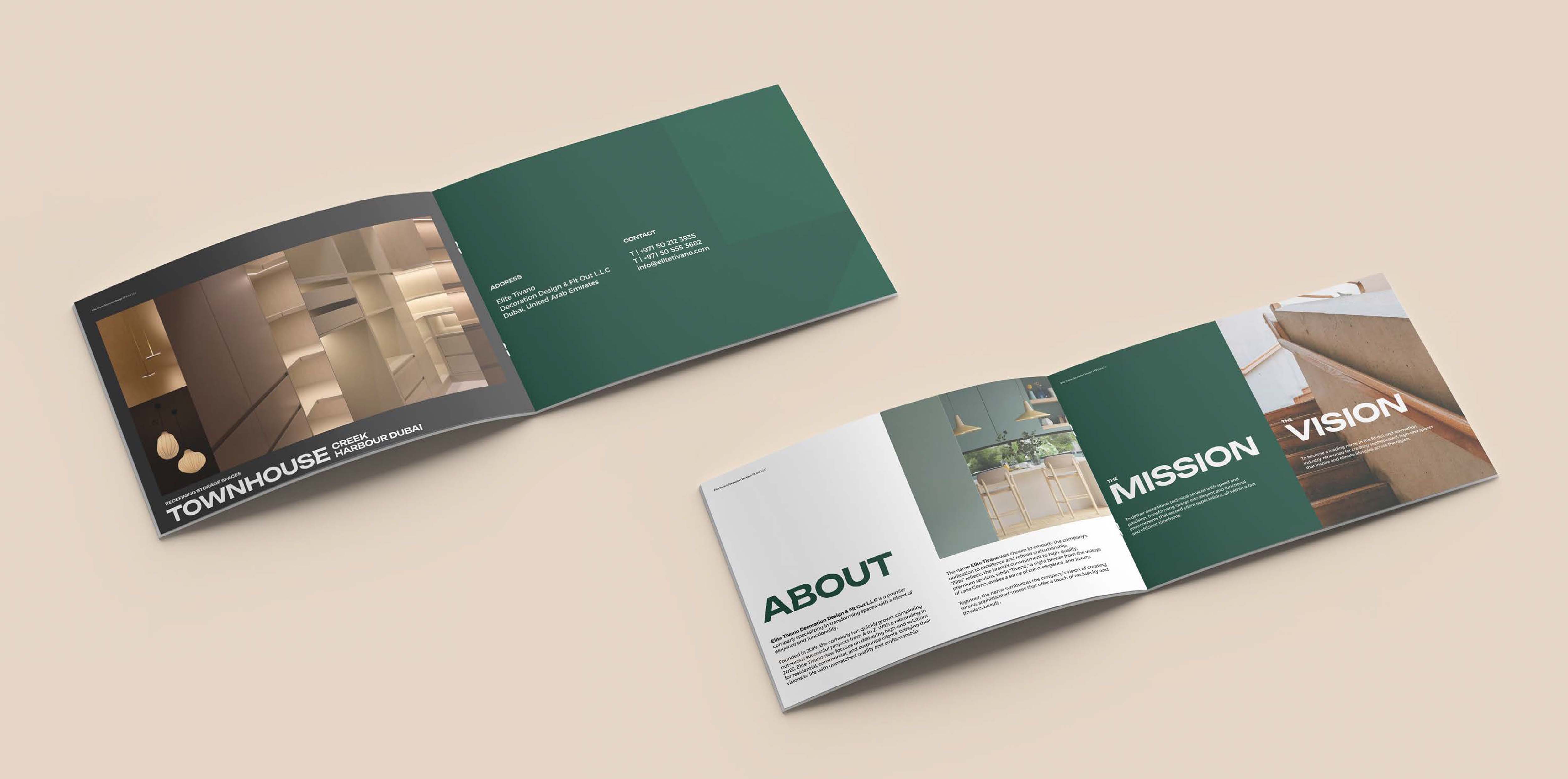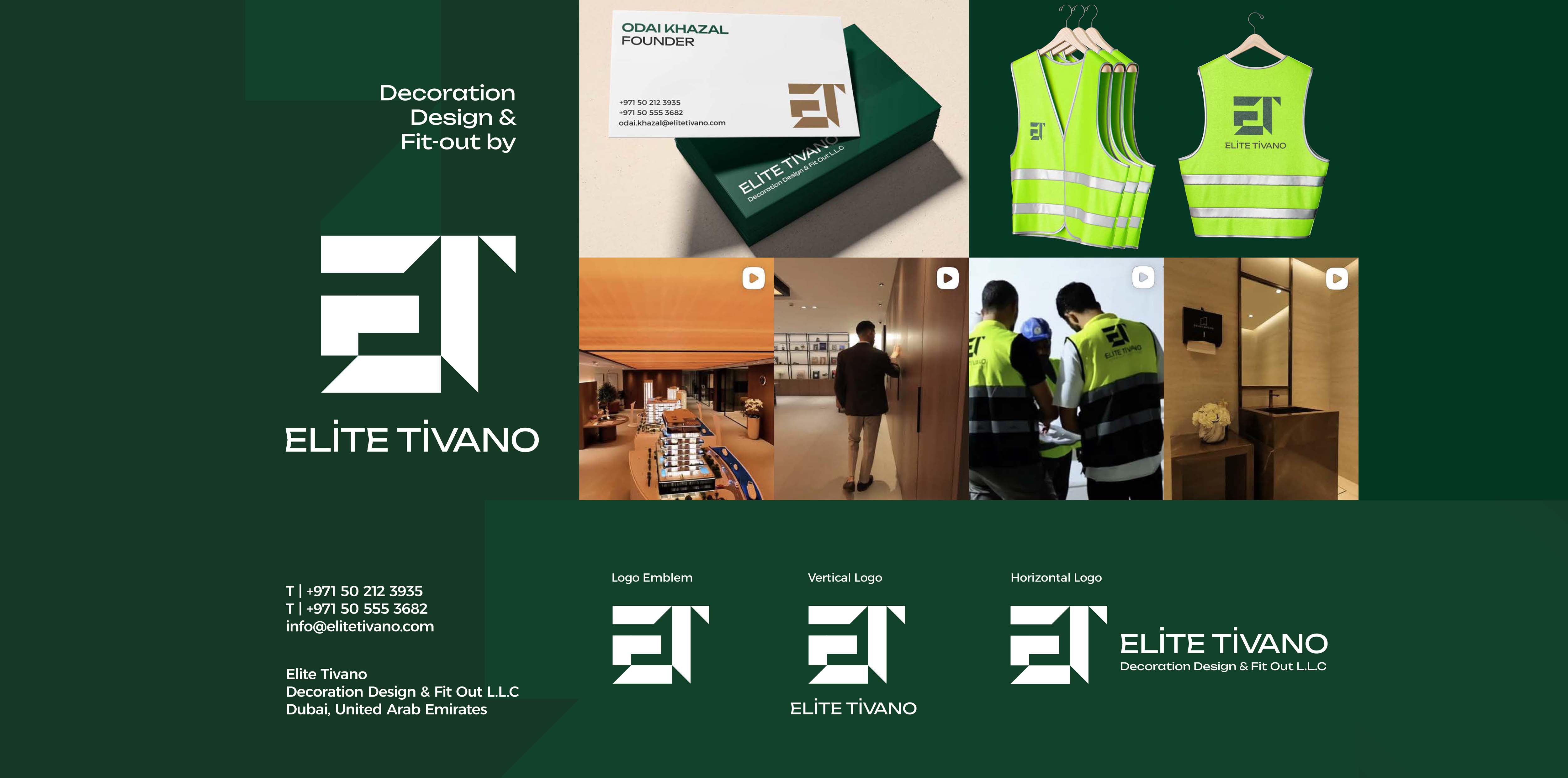The project began with a full brand identity build, delivering a distinctive logo system, visual identity, and brand guidelines that positioned Elite Tivano as a premium fit-out specialist in the Dubai market. The brand was built around a sharp, architectural aesthetic that reflected the precision and craft of the company's work. Business cards, stationery, and branded collateral were produced as part of the initial identity rollout.